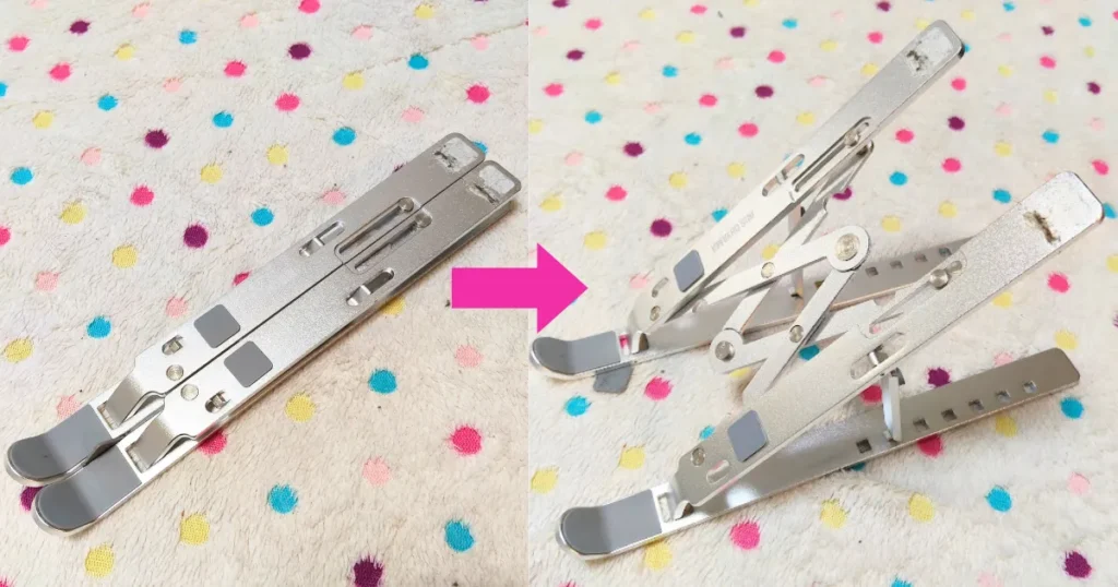 ネットでおすすめされていた商品のうち、お手頃なものを購入。折りたたみ式でコンパクトになるし、高さを何段階も変えられて便利そう…と思ったけど、PCを載せた状態で動かしたいとき、すぐ台座部分が外れてしまうのが難点。